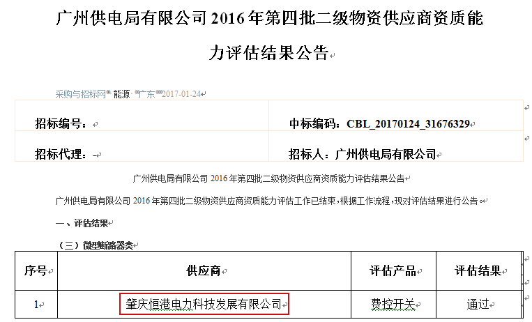 廣州供電局有限公司2016年第四批二級物資供應商資質能力評估結果公告