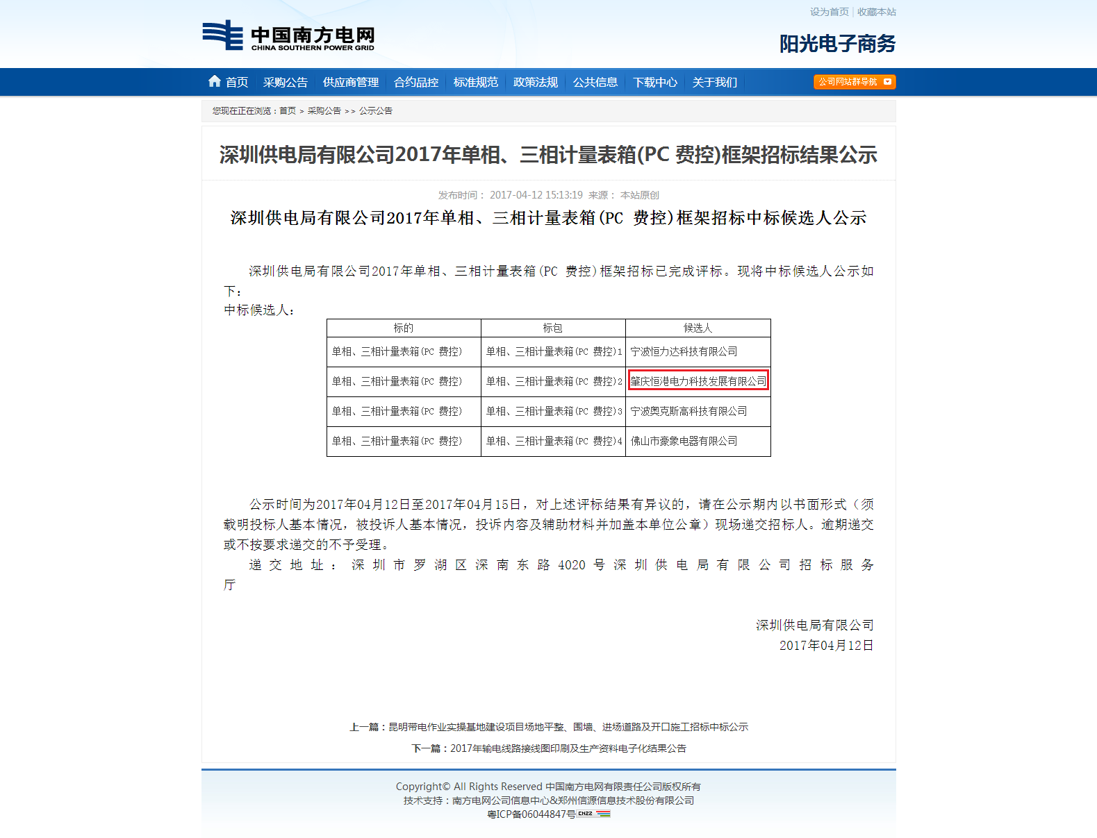 深圳供電局有限公司2017年單相、三相計量表箱(PC 費控)框架招標結果公示