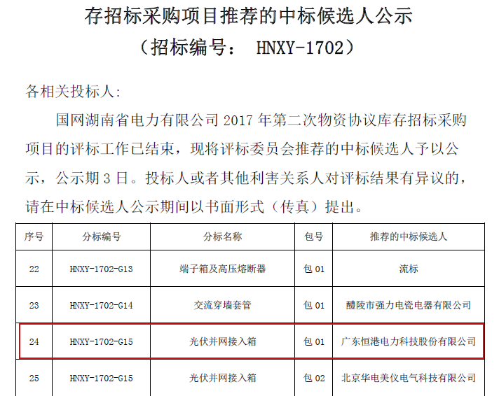 國網(wǎng)湖南省電力有限公司2017年第二次物資協(xié)議庫存招標(biāo)采購項(xiàng)目(招標(biāo)編號(hào):HNXY-1702)項(xiàng)目推薦的中標(biāo)候選人公示