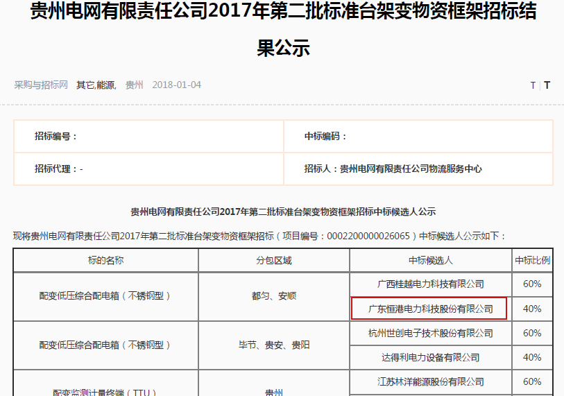 貴州電網有限責任公司2017年第二批標準臺架變物資框架招標結果公示