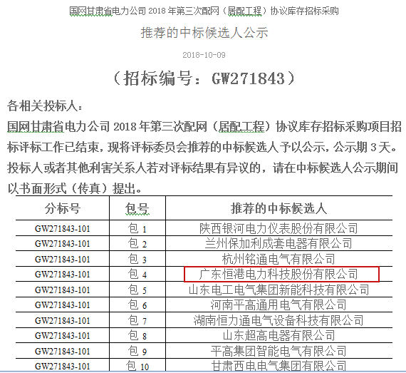 熱烈祝賀我司在國網甘肅省電力公司2018年第三次配網(居配工程)協議庫存招標采購項目中標