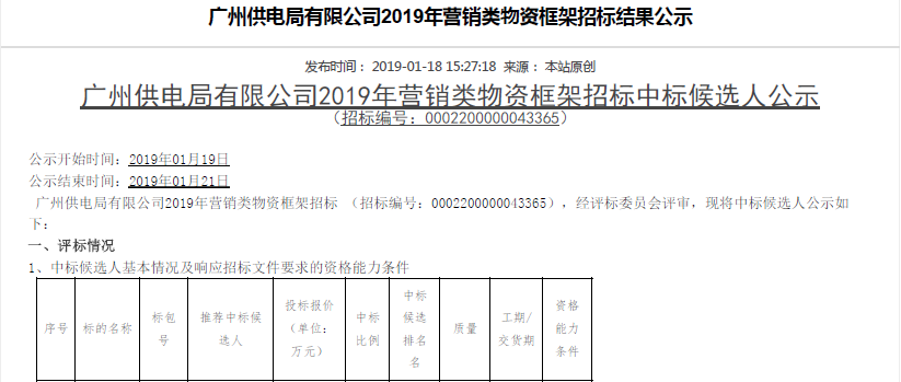 熱烈祝賀我司在廣州供電局有限公司2019年營銷類物資框架招標中標