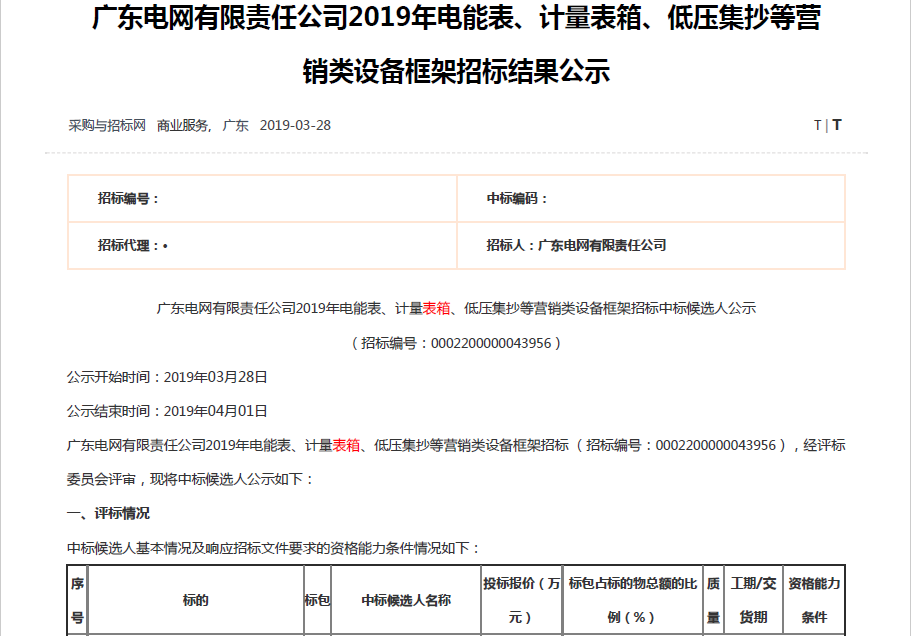 熱烈祝賀我司在廣東電網有限責任公司2019年電能表、計量表箱、低壓集抄等營銷類設備框架招標中標