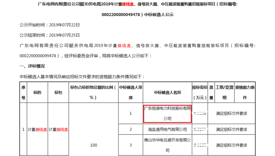 熱烈祝賀我司在廣東電網有限責任公司韶關供電局2019年計量接線盒、信號放大器、中壓載波裝置購置招框架標項目中標