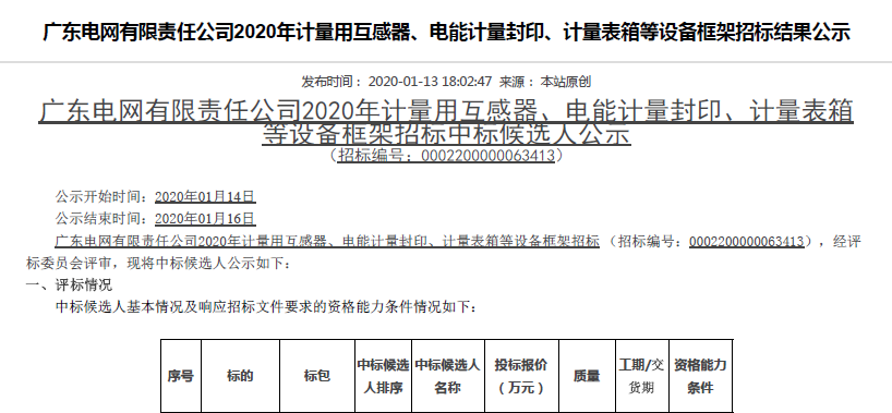 熱烈祝賀我司在廣東電網有限責任公司2020年計量用互感器、電能計量封印、計量表箱等設備框架招標中標
