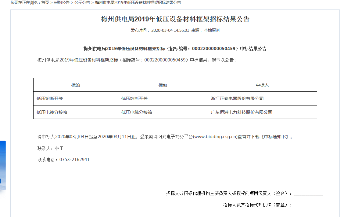 熱烈祝賀我司在梅州供電局2019年低壓設備材料框架招標中標