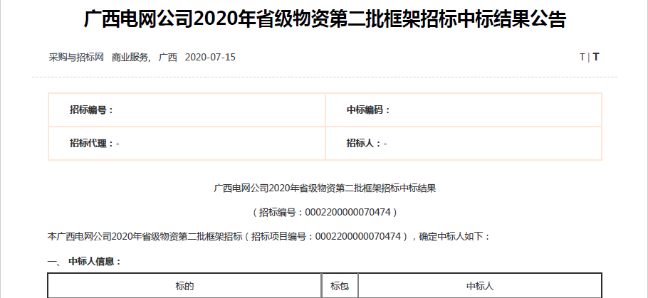 熱烈祝賀我司在廣西電網公司2020年省級物資第二批框架招標中標